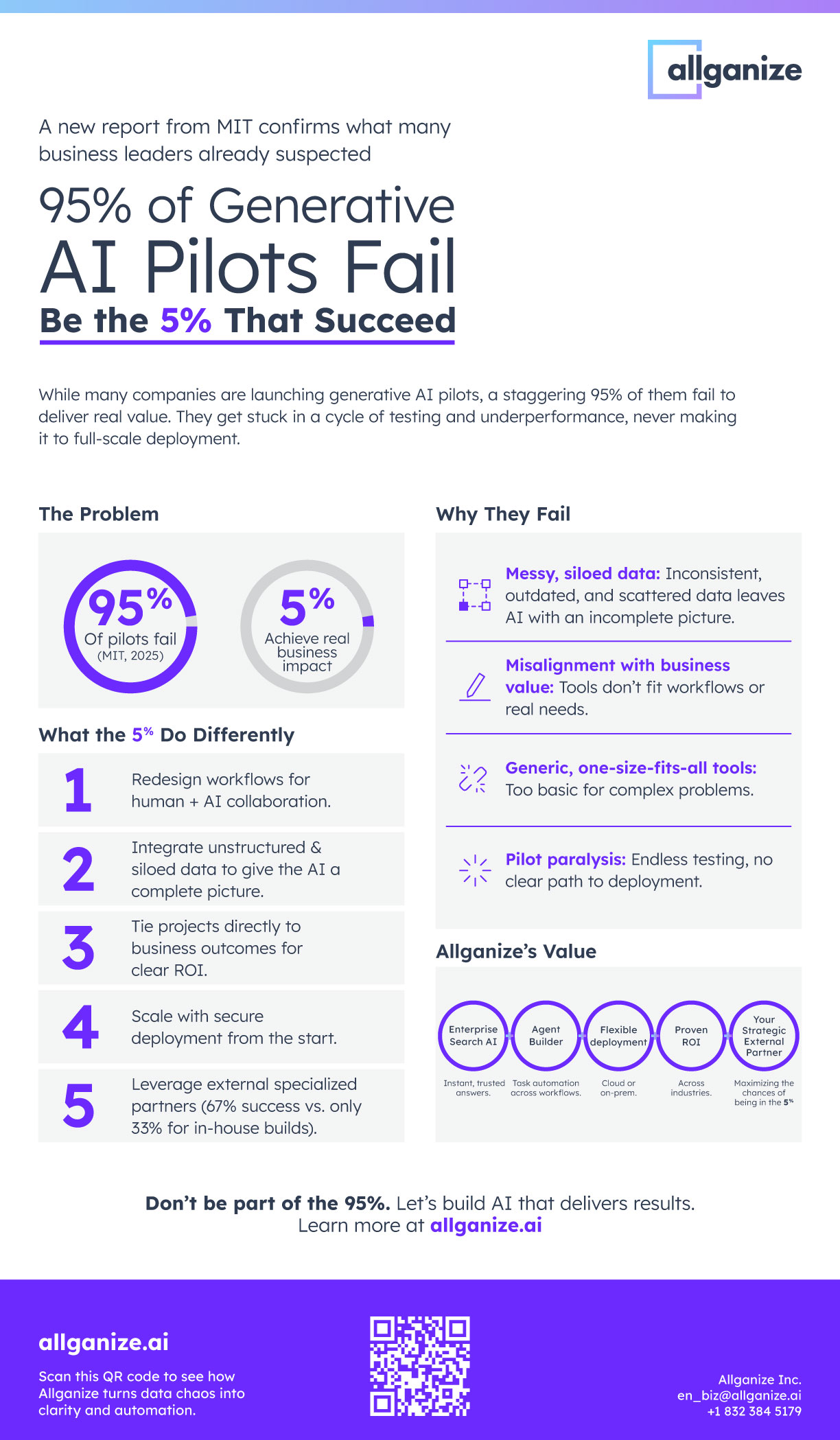 A new MIT report reveals 95% of generative AI pilots fail to deliver ROI. The 5% that succeed focus on messy data, business alignment, and expert partners. Discover how Allganize helps enterprises skip pilot paralysis and scale AI for real business impact.
