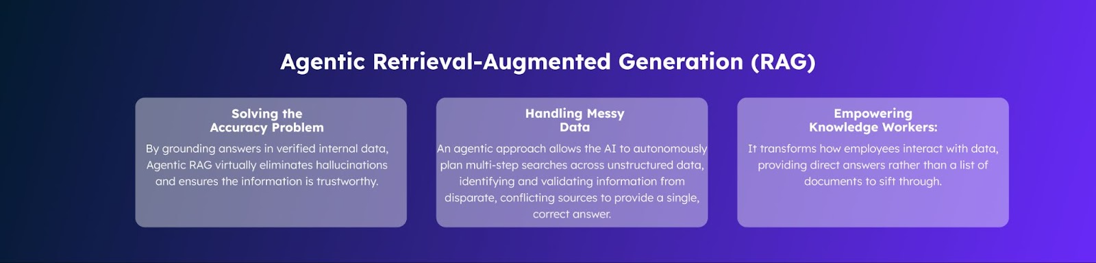 • Solving the Accuracy Problem: By grounding answers in verified internal data, Agentic RAG virtually eliminates hallucinations and ensures the information is trustworthy.