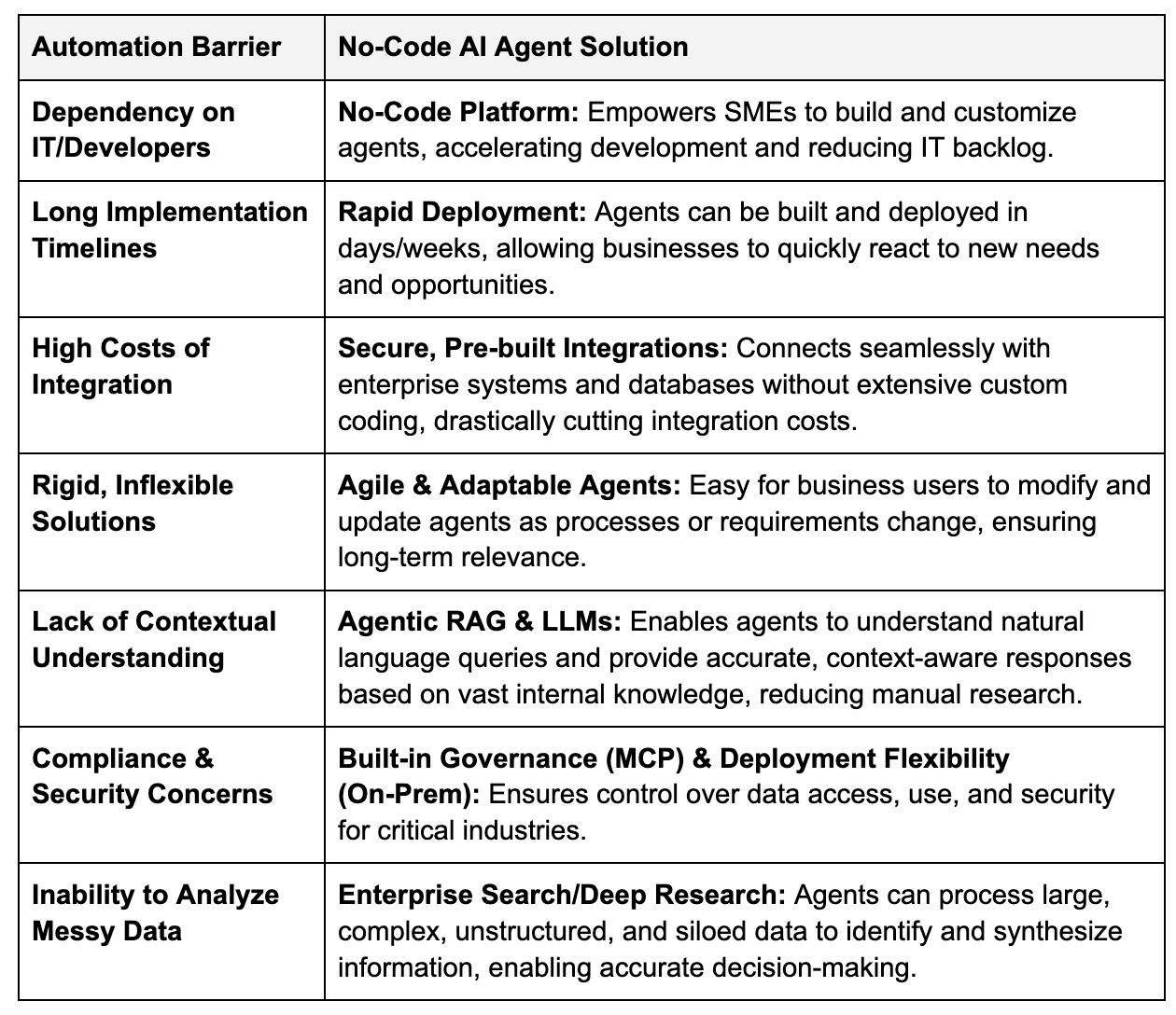 This table illustrates how no-code AI agents directly address the fundamental barriers of traditional automation: