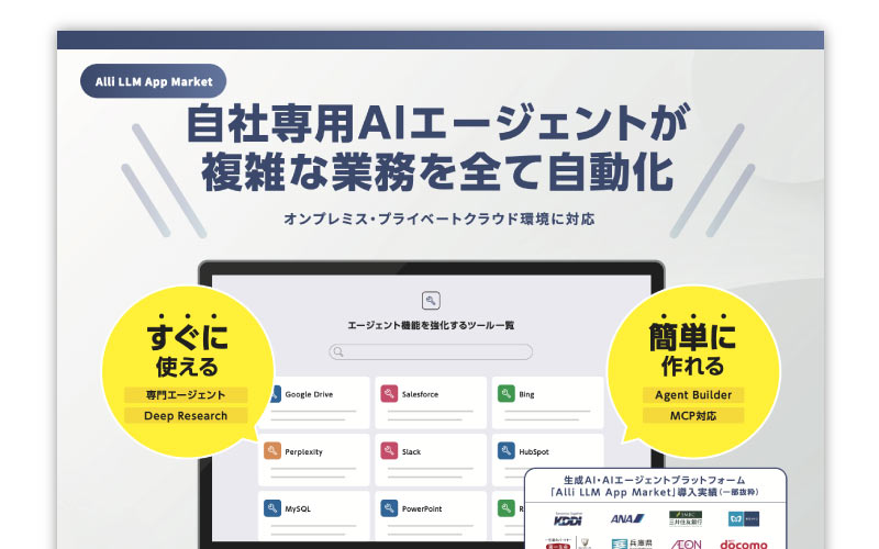 なぜ、日本のリーディングカンパニーは生成AI活用基盤としてAllganizeを選ぶのか?オールインワン生成AI・AIエージェントプラットフォーム「Alli LLM App Market」のお客様の生成AI活用・DX推進施策、活用方法、導入効果をお客様の声と共にご紹介。