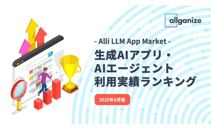 「Alli LLM App Market」における「生成AIアプリ・AIエージェント利用実績ランキング」2025年8月版。人気の生成AIアプリ・AIエージェントTop5の詳細、人気の背景、活用業務、導入効果等をご紹介。