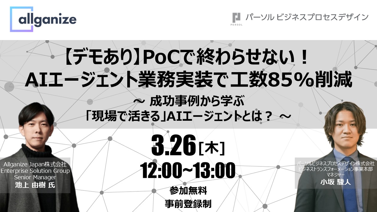 パーソルビジネスプロセスデザイン株式会社主催のイベントにAllganize Japanが共催・登壇いたします。AIエージェントに取り組んだ具体的な事例や、デモが満載のおすすめのセミナーです。ぜひご参加ください。